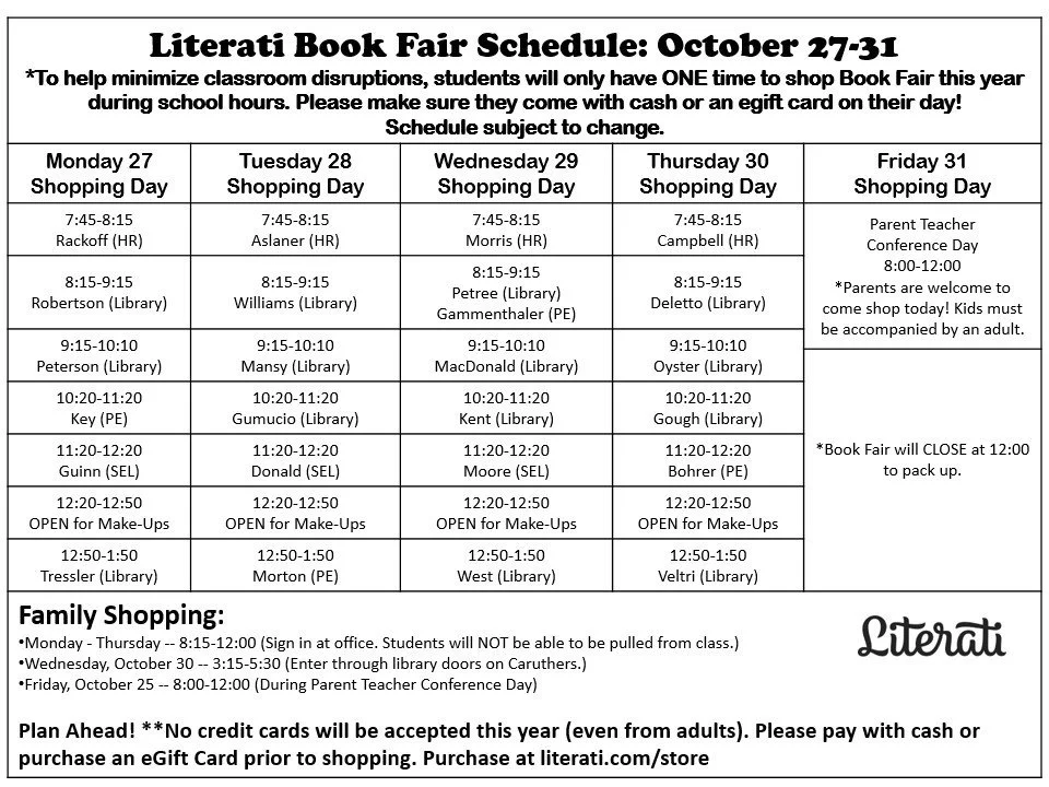 It's the MOST WONDERFUL time of year -- Book Fair time! Our Literati Book Fair is October 27-31- it's always a fun week where kids love getting to shop for new books (& learning how to budget that money a bit in the process). Our goal every year is for EVERY student to shop (click the link for more info on how you can donate to other kiddos). Plus, our library benefits from a portion of the sales! Below we've listed some quick links of important info and the website with ALLLL the details (including the schedule of when each class will be shopping during school hours.)
