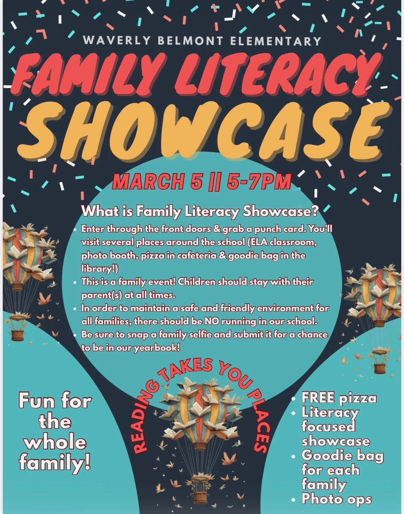 Lastly, Mark your calendars for the Family Literacy Showcase on March 5th from 5-7pm. This fun FREE event includes pizza, activities a goodie bag and book for each family! Come enjoy all the amazing places reading can take you (including WBES!)