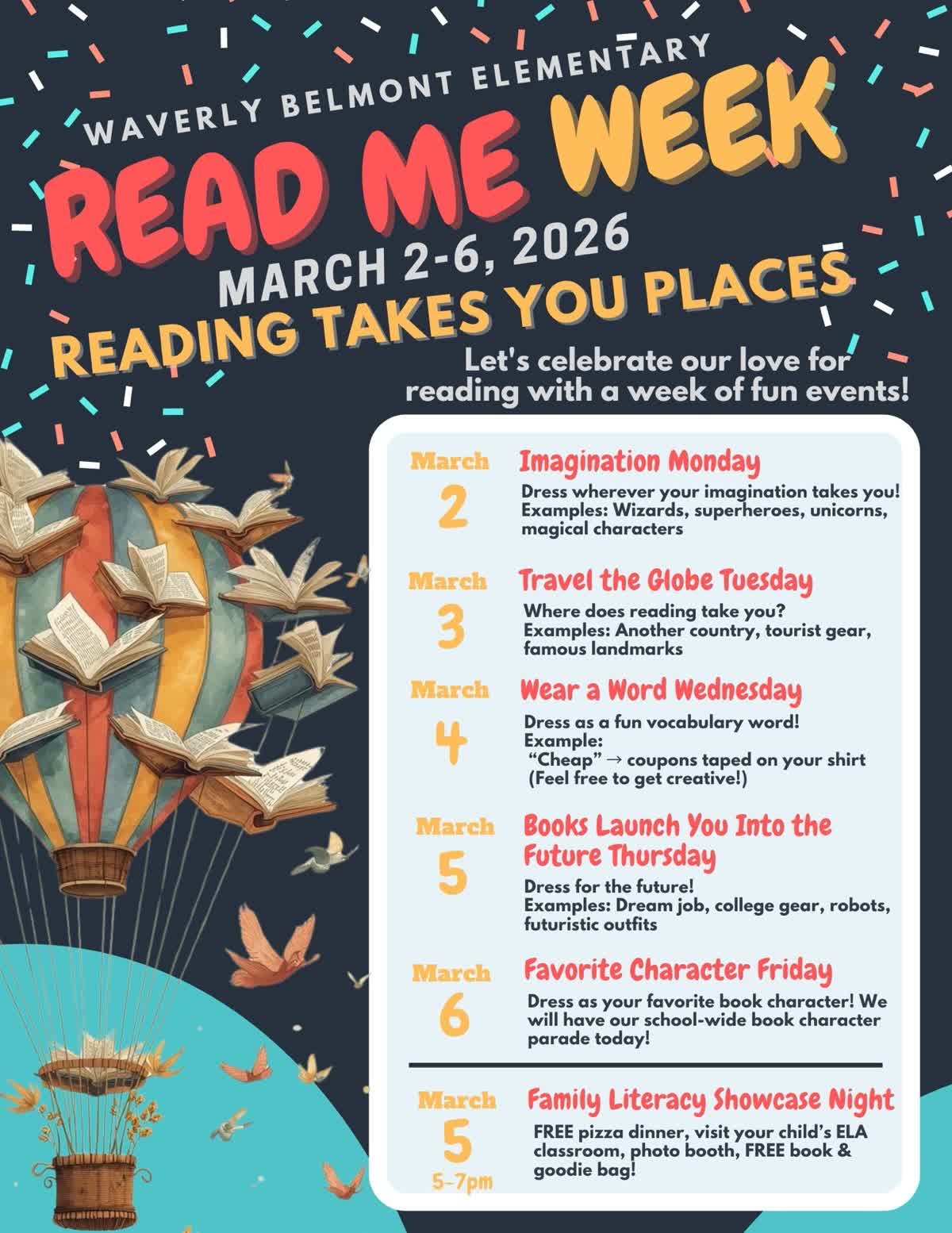 Read Me week is one of the most fun weeks of the year at WBES! The theme this year is “Reading Takes You Places.” Check out the flyer below for the dress up day themes, Literacy night info and volunteer requests!