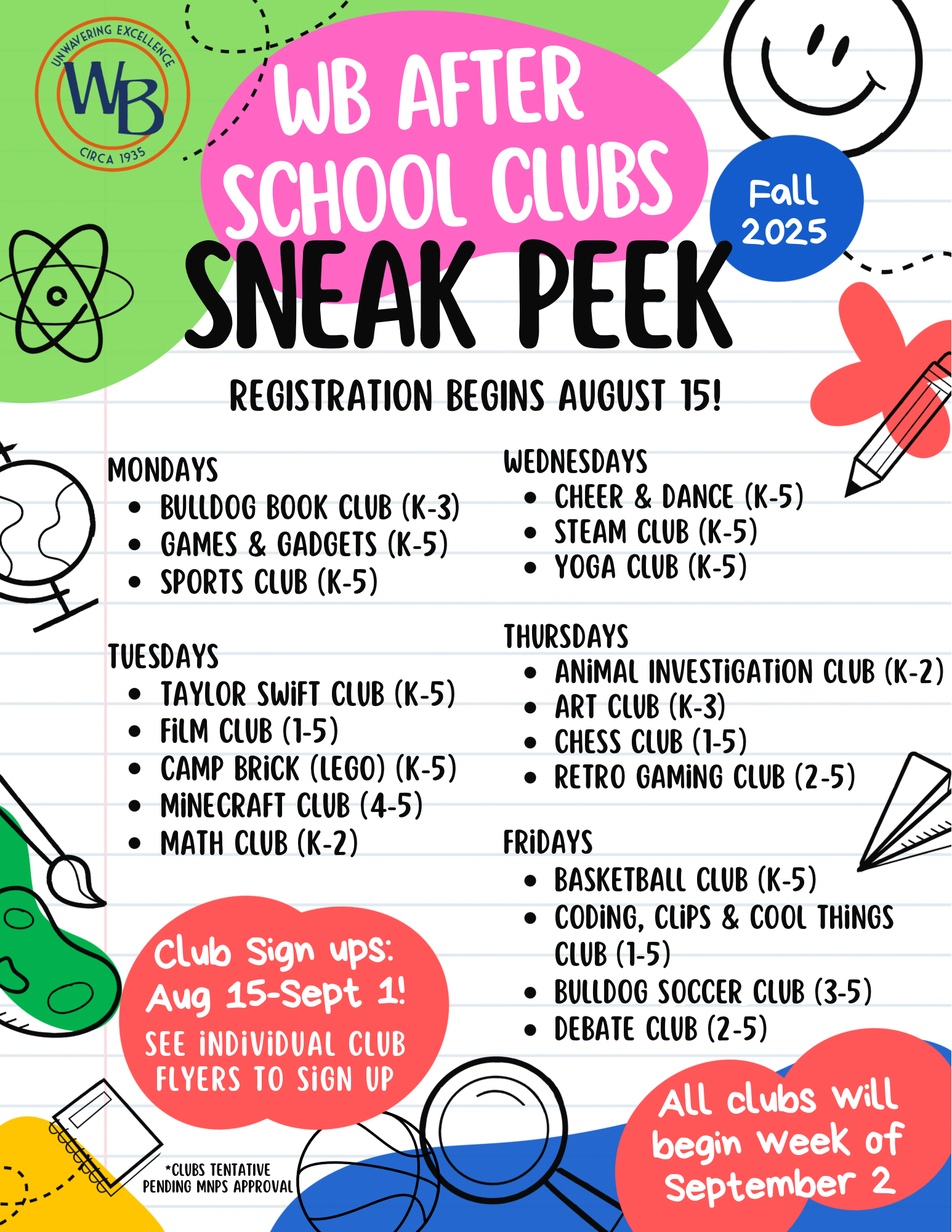 Club Signups officially begin this FRIDAY, AUGUST 15th. We've got all the important details you need to know get get your kiddo enrolled in their after-school-fun of choice. There are so many great options that we created a whole page dedicated to what's going on so you can keep track. Each club has different costs, registration processes, etc. so be sure to check each poster and make sure you konw what to do.