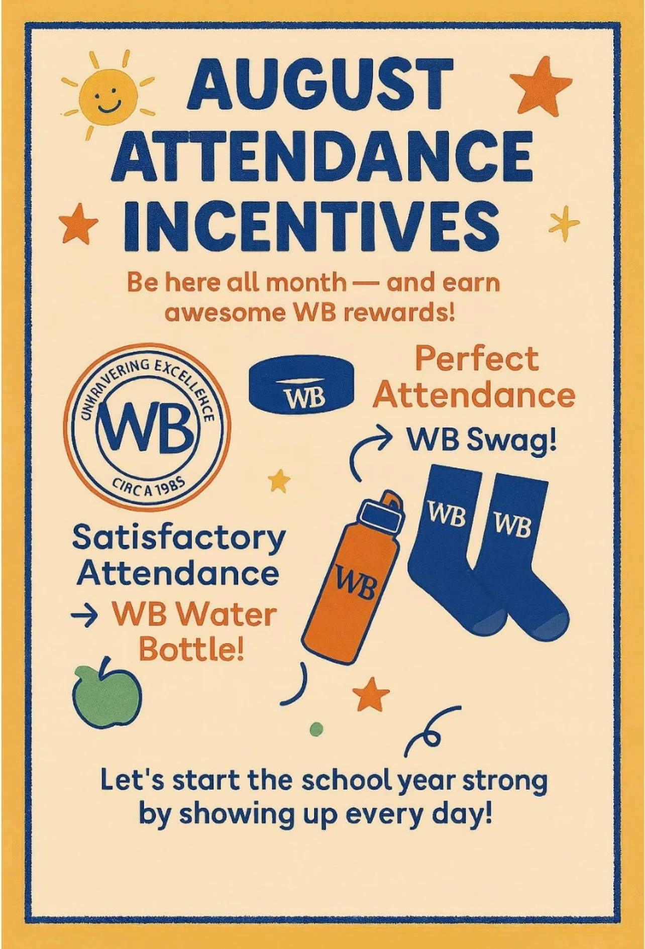 Attendance matters: when students miss school, they miss out. It's also important for students to be in the classroom on time. This August, students have the opportunity to earn some awsesome WB rewards when they are in school! See incentives below.